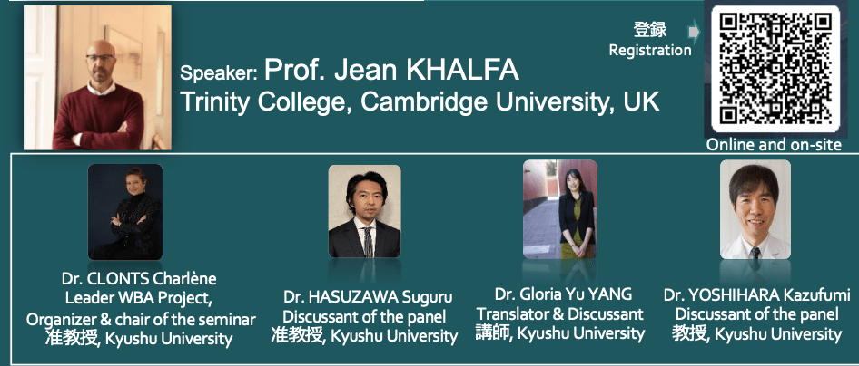 Prof. Jean Khalfa, Trinity College Cambridge, UK, has made us the honour to be a guest speaker for a seminar entitled « Philosophy, Psychiatry, and Freedom », at Kyushu University, Japan. The venue will be at Ito Campus, Central Library, Sky Cute Commons conference room, on Friday 11th April 2025, from 2 pm to 3:30 pm. Please register via the QR code on the image or on the poster below, or via this online form: https://forms.office.com/r/kJyPzmPR2c